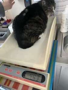 Foka trafiła do nas w grudniu 2024, z ogromną nadwagą (ważyła ok. 7,8 kg), cukrzycą, alergią i zszarganymi nerwami – do tego stopnia, że miała łapkę wylizaną do gołej skóry… Właściciele zrzekli się jej zaraz po tym, jak zrezygnowali z leczenia i poprosili o eutanazję Foczki 😢
