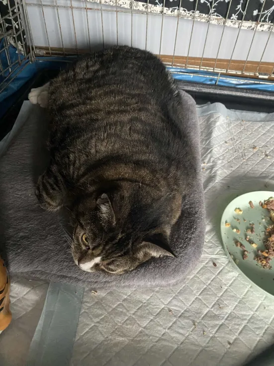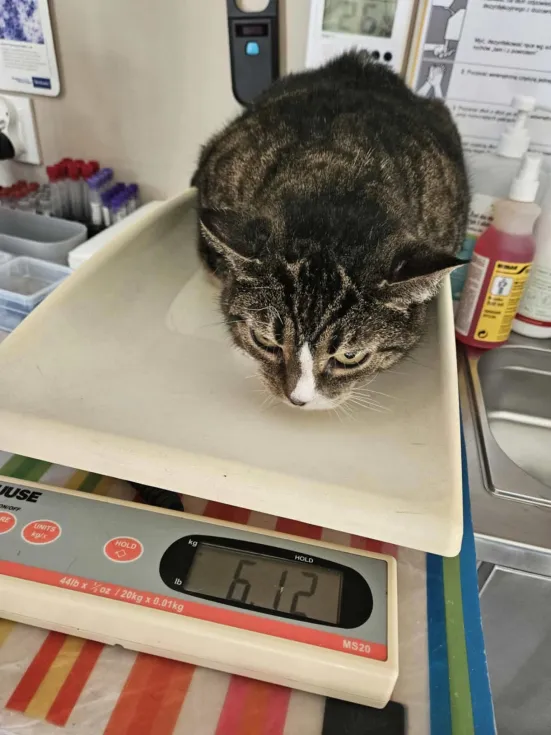 Foka trafiła do nas w grudniu 2024, z ogromną nadwagą (ważyła ok. 7,8 kg), cukrzycą, alergią i zszarganymi nerwami – do tego stopnia, że miała łapkę wylizaną do gołej skóry… Właściciele zrzekli się jej zaraz po tym, jak zrezygnowali z leczenia i poprosili o eutanazję Foczki 😢